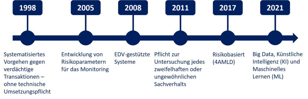 Transaktionsmonitoring zählt heute zu den zentralen Instrumenten der Geldwäsche- und Betrugsprävention im Finanzsektor. Die Pflicht zur Überwachung auffälliger Transaktionen wurde in Deutschland jedoch nicht von Anfang an gesetzlich verankert. Vielmehr entwickelte sich das heutige System über mehrere Jahrzehnte aus aufsichtsrechtlichen Empfehlungen, EU-Vorgaben und zunehmend verpflichtenden gesetzlichen Regelungen. Dieser Artikel zeigt die Entwicklungslinie von 1998 bis 2025 im Überblick.